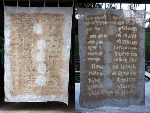 Jedno z 4 dwustronnych płócien tworzących cykl Journey I-IV. Organiczne pigmenty i wosk na płótnie bawełnianym, elementy techniki batiku.