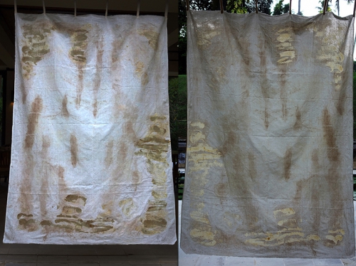 Jedno z 4 dwustronnych płócien tworzących cykl Journey I-IV. Organiczne pigmenty i wosk na płótnie bawełnianym, elementy techniki batiku.