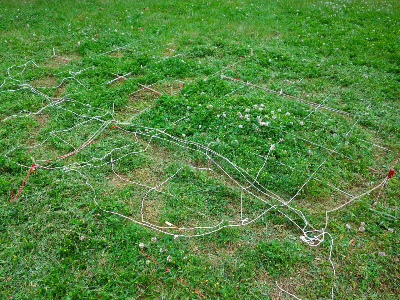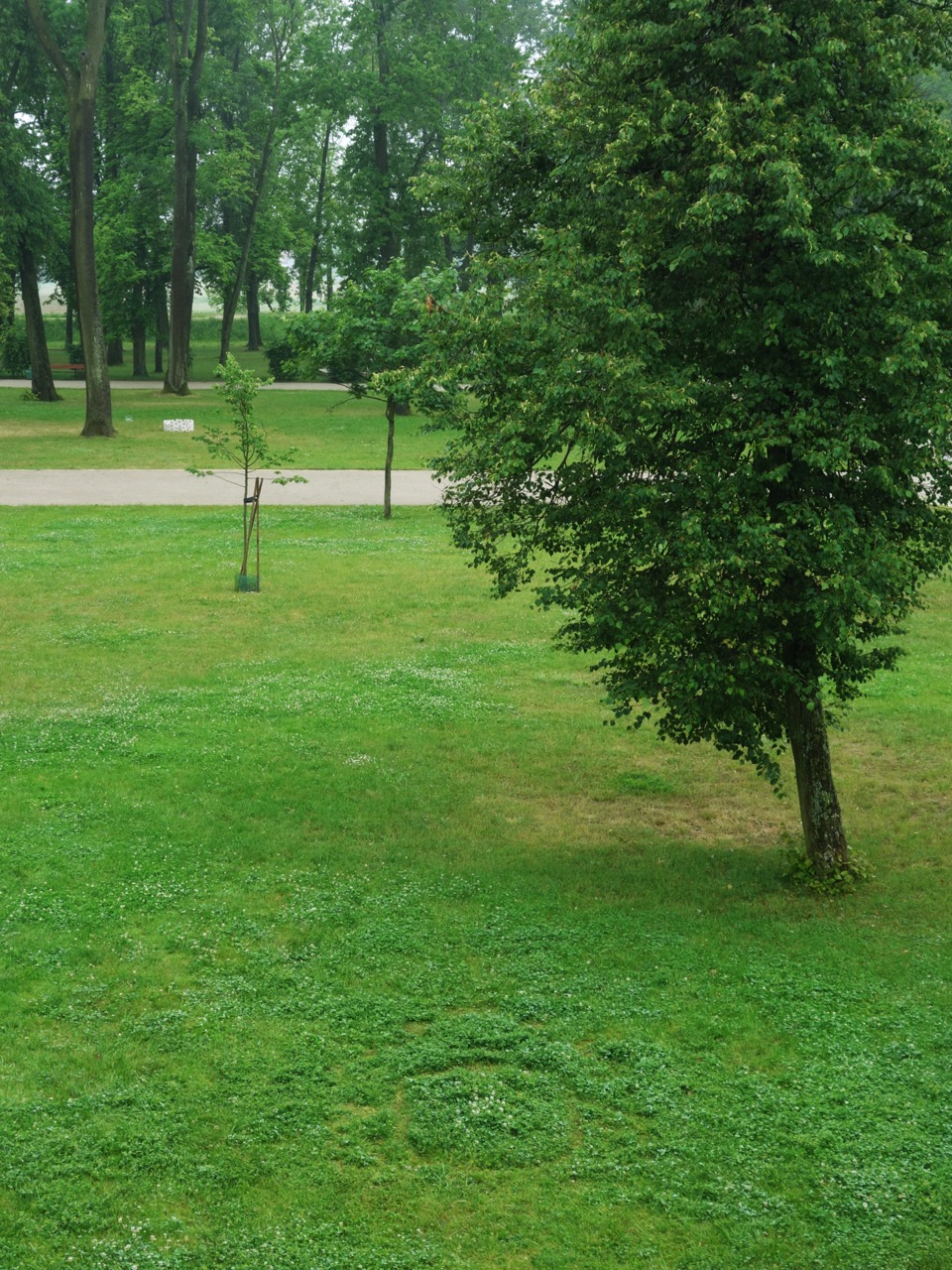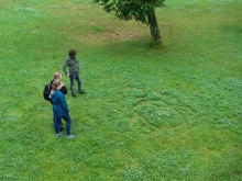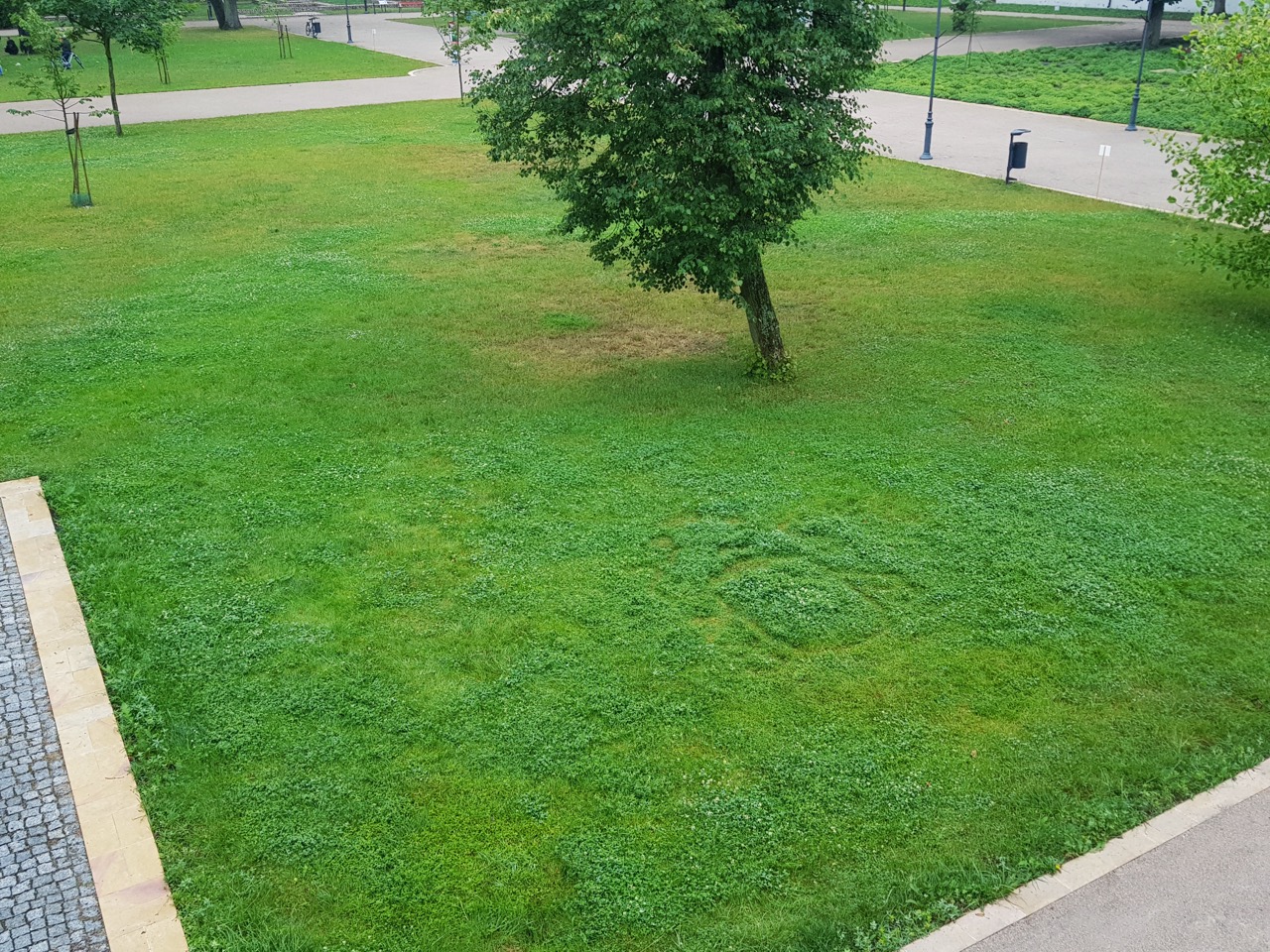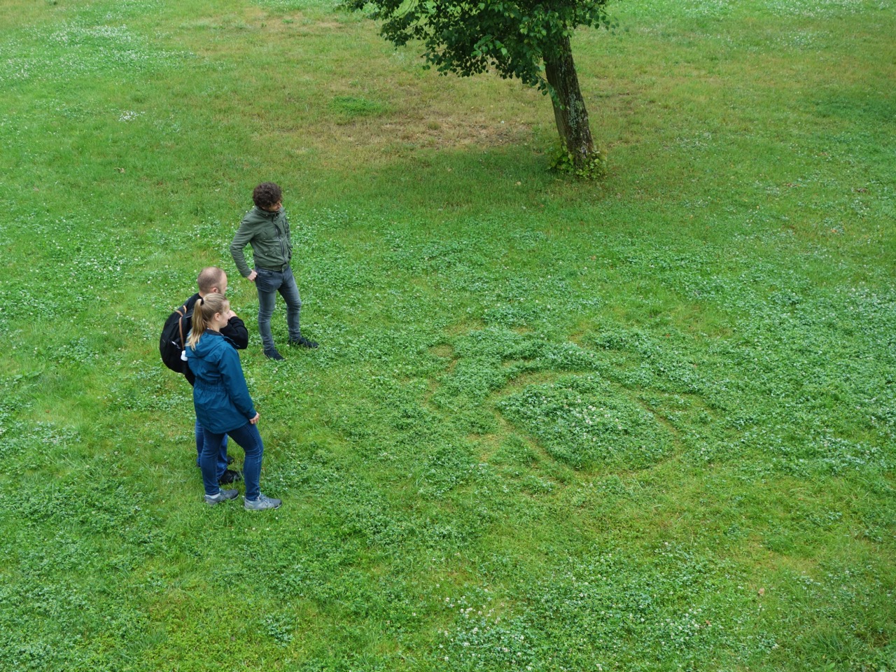 Praca nawiązuje do herbu Trąby księcia Aleksandra Ludwika Radziwiłła, dzięki któremu powstał zamek w Białej Podlaskiej. Rodzina Radziwiłłów herbu Trąby przyczyniła się do znacznego rozwoju Białej Podlaskiej i regionu, dlatego warto – mówiąc językiem współczesnym – otagować ich obecność (czy zostawić znak wodny, co też się kojarzy z proponowanym efektem). Można założyć, że swoistym hasztagiem był kiedyś herb. Odwołuję się do niego ponownie w formie wycinanki na trawniku pałacowego parku. Wycinanka jest ręczna (z wykorzystaniem nożyczek), co jest odniesieniem do budowy zamku i otoczenia parkowego – tradycyjnego budowania i tworzenia – spokojnie, krok po kroku, z należnym namysłem. Czytelność herbu trwa, dopóki przycięta prawie do gruntu trawa nie odrośnie z powrotem. Taka technika jest ekologiczna, a praca inicjuje refleksję dotyczącą rozległej tematyki: trwałości posiadania, odciśnięcia swojego materialnego śladu w konkretnej przestrzeni oraz przestrzeni historycznej, a także aspekt współczesnego cyfrowego istnienia, kiedy w jednym momencie coś jest przebojem (Internetu) i jeszcze szybciej przestaje, i nikt już o tym nie pamięta.