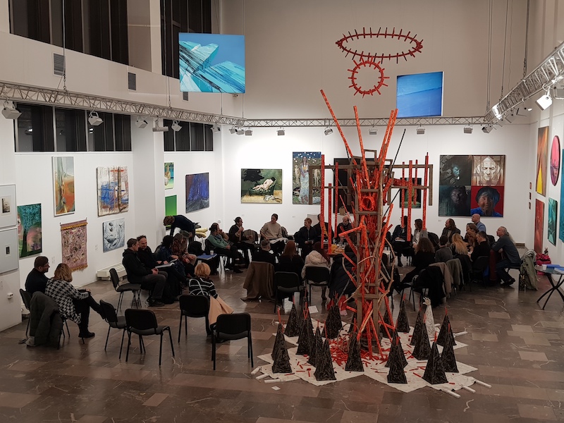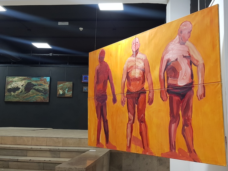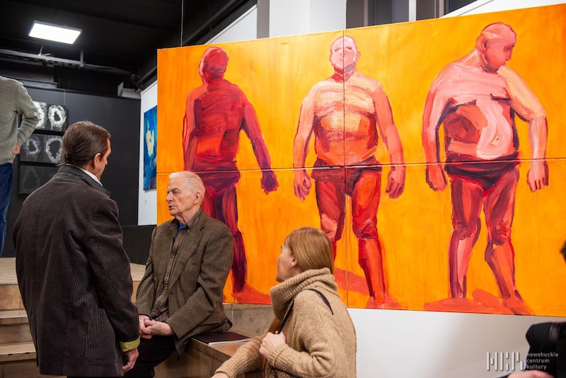 source: Nowohuckie Centrum Kultury | Students meeting with the Professor. Photo by MK. | Exhibition view. "Park sunbathing" visible from afar. Photo by MK. | "Park sunbathing" versus the Professor's paintings. Photo by MK. |