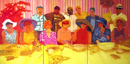 Sytuacja, w której brałam udział: przyjęcie urodzinowe pana domu, podczas którego spotkali się krakowscy reprezentanci klasy średniej i artyści. Mój obraz kolorystyką nawiązuje do barw kalifornijskiego snu, lecz kompozycją i proporcjami płótna, m.in. do obrazu o historycznej inspiracji "Uczta u Wierzynka" B. Abramowicza (1876).