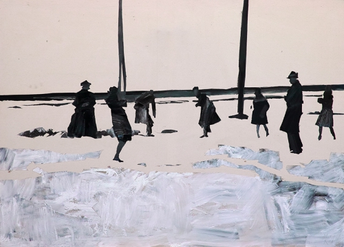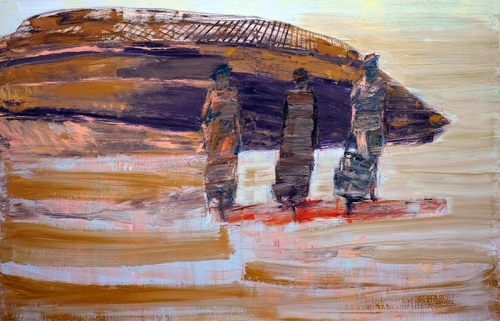 Construction of the Piłsudski Monument in Krakow. It was decided that it would have the form of a mound, in reference to the already existing commemoration – the mound of Tadeusz Kościuszko, and the pagan mounds preserved in the area occupied by the city of Krakow. The construction was a universal act, and even ladies in hats and lace gloves took a symbolic part in this action. My grandmother and her friends also joined in, which was then rather typical, desirable, and of course fashionable. I used the then almost “selfie” that the ladies had made on this occasion: on the construction site, with the appropriate attributes - wheelbarrows filled with building material, and monument under construction in the background, and the heroines of the picture are elegantly dressed – in their party dresses, hats and lace gloves. In this spirit, too, I painted the first version of the painting ("Construction of the Mound, 1937"). In the second version, based on artistic solutions - the method of painting the majority of the canvas’s surface, the least in the patch of the mound – there was an allusion to oriental travel, popular in certain milieus as early as the 19th century. We are familiar with the typical photographic documentation of such expeditions depicting people in dressed in the European, almost party style, against the pyramids, and often with a camel – in other words, the appearance of the character appears completely absurd in the context of the place. The lack of detail, the free movement of the brush in the picture give the impression of mirage (an effect typical of desert areas) and, together with the colors, they emphasize the aforementioned reference.